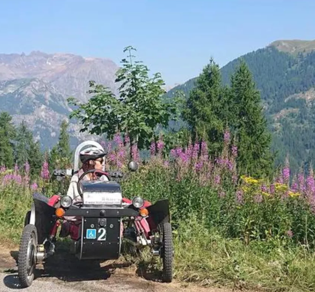 Nous accompagnons par groupe de 5 personnes (tous types de handicaps et personnes valides) en randonnées par le biais de véhicules tout terrain électriques équipés PMR (pilotage au volant).